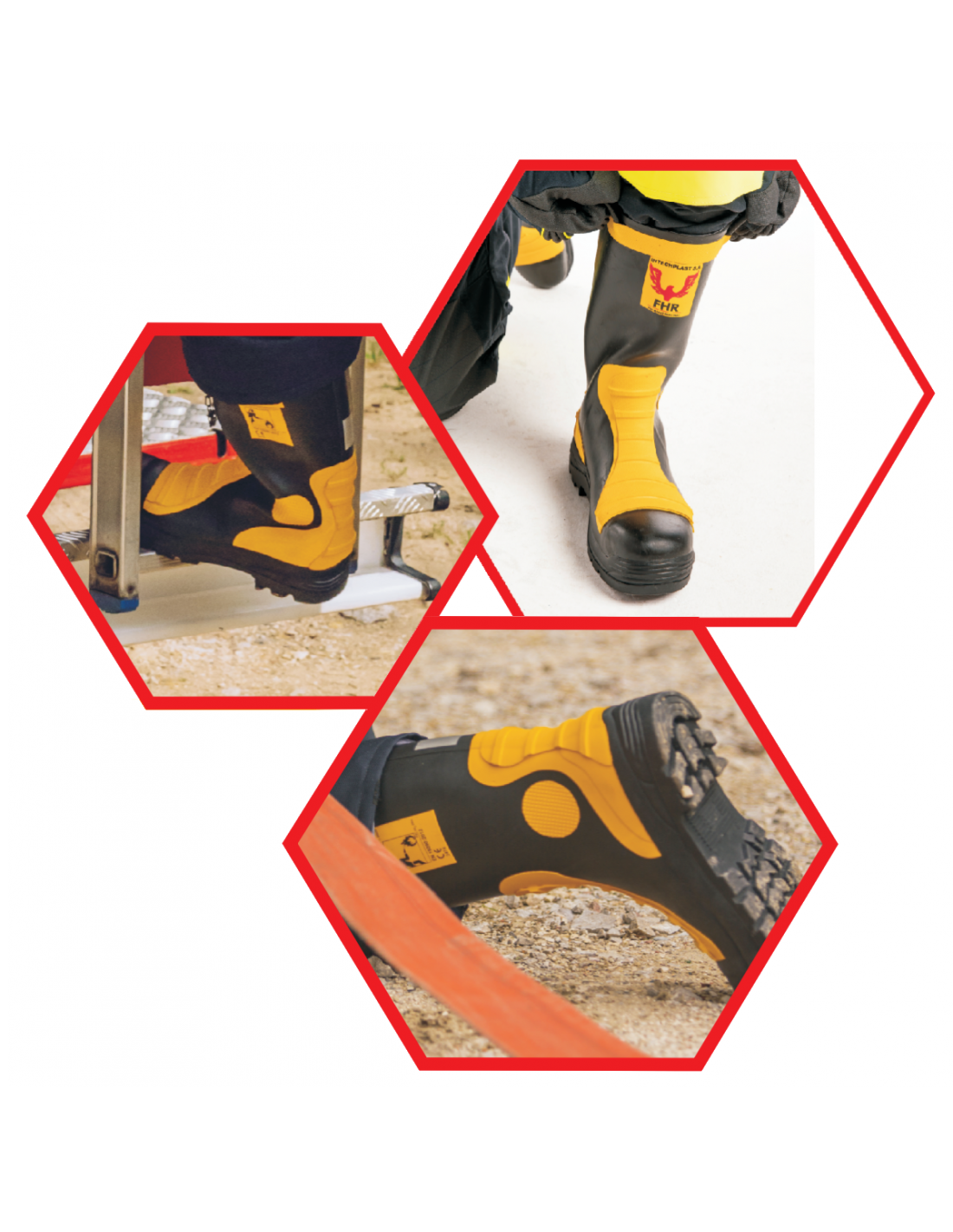 Buty gumowe o właściwościach elektroizoacyjnych (oba modele FHR 003 i FHR 004), odporne na przecięcie piłą łańcuchową dzięki strefie ochronnej w przedniej części cholewki (tylko model FHR 004), wyposażone w wyjmowaną wewnętrzną wkładkę ocieplającą/skarpetę.