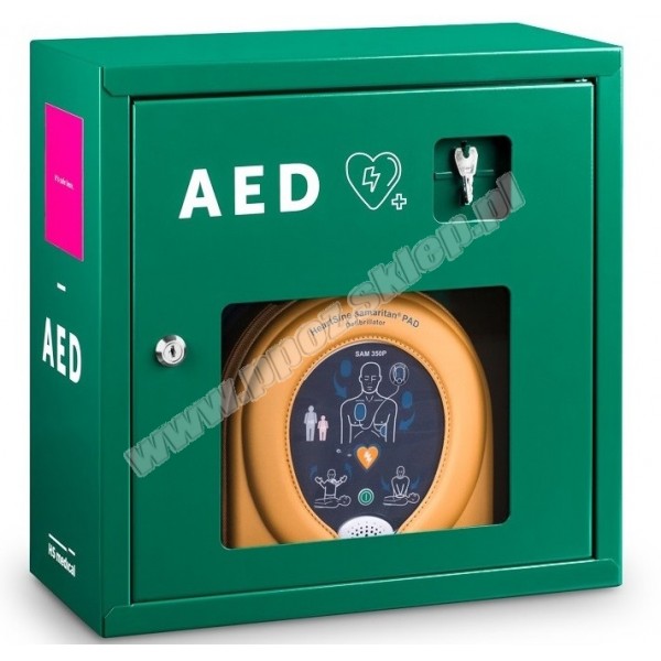 Kwadratowa, metalowa szafka została zaprojektowana specjalnie na wymiar defibrylatorów Samaritan Pad. Wykonane z solidnej blachy ścianki odpowiednio chronią urządzenie, a szklana szybka eksponuje oraz umożliwia stałą obserwację kontrolki AED. Na szafkach umieszczone są kontrastowe napisy, które wskazują co znajduje się w środku szafki. Szafki posiadają kluczyk zamknięty za szklanką szybką, dzięki czemu chronią AED przed osobami nieupoważnionymi. Łatwy dostęp do szafki w razie potrzeby użycia AED umożliwia system "zbij szybkę". Szafka sprawdzi się w zakładzie pracy, biurowcu czy też na recepcji, wszędzie tam, gdzie AED ma być przechowywane wewnątrz budynku.