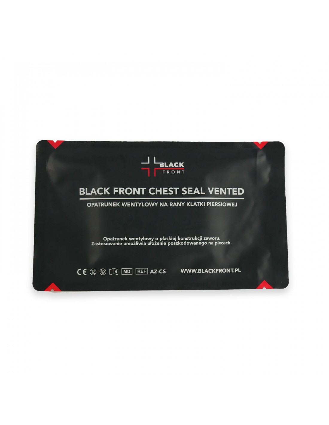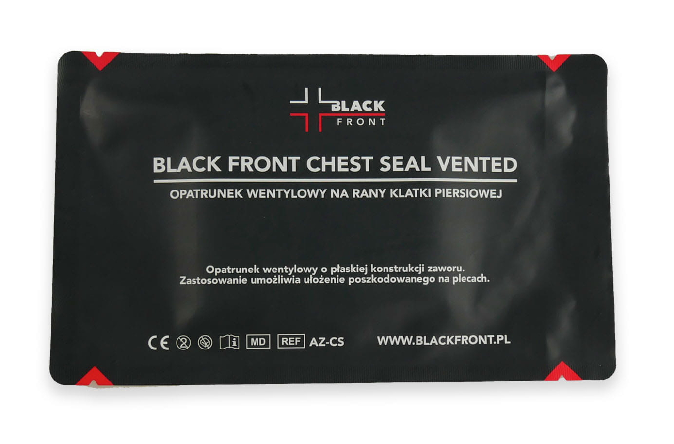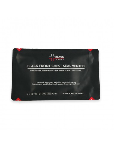 BLACK FRONT Chest Seal Vented to opatrunek wentylowy o płaskiej konstrukcji zaworu przeznaczony do opatrywania ran w obrębie klatki piersiowej. Jednokierunkowa konstrukcja zaworu umożliwia jednocześnie wypuszczanie powietrza zalegającego w klatce piersiowej, zmniejszając tym samym ryzyko wystąpienia odmy prężnej oraz blokuje dostęp powietrza z zewnątrz.