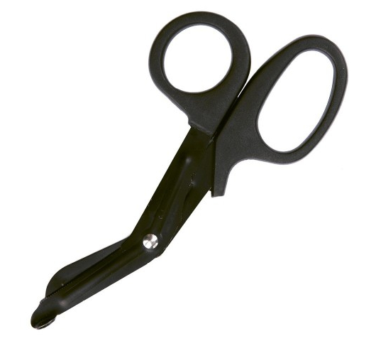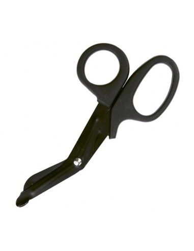 Nożyczki ratownicze BLACK FRONT, duże i czarne, o długości 19 cm, wykonane z utwardzonego stali z ząbkami na ostrzu, idealne do cięcia opatrunków, ubrań i pasów bezpieczeństwa. Możliwość sterylizacji w autoklawie.