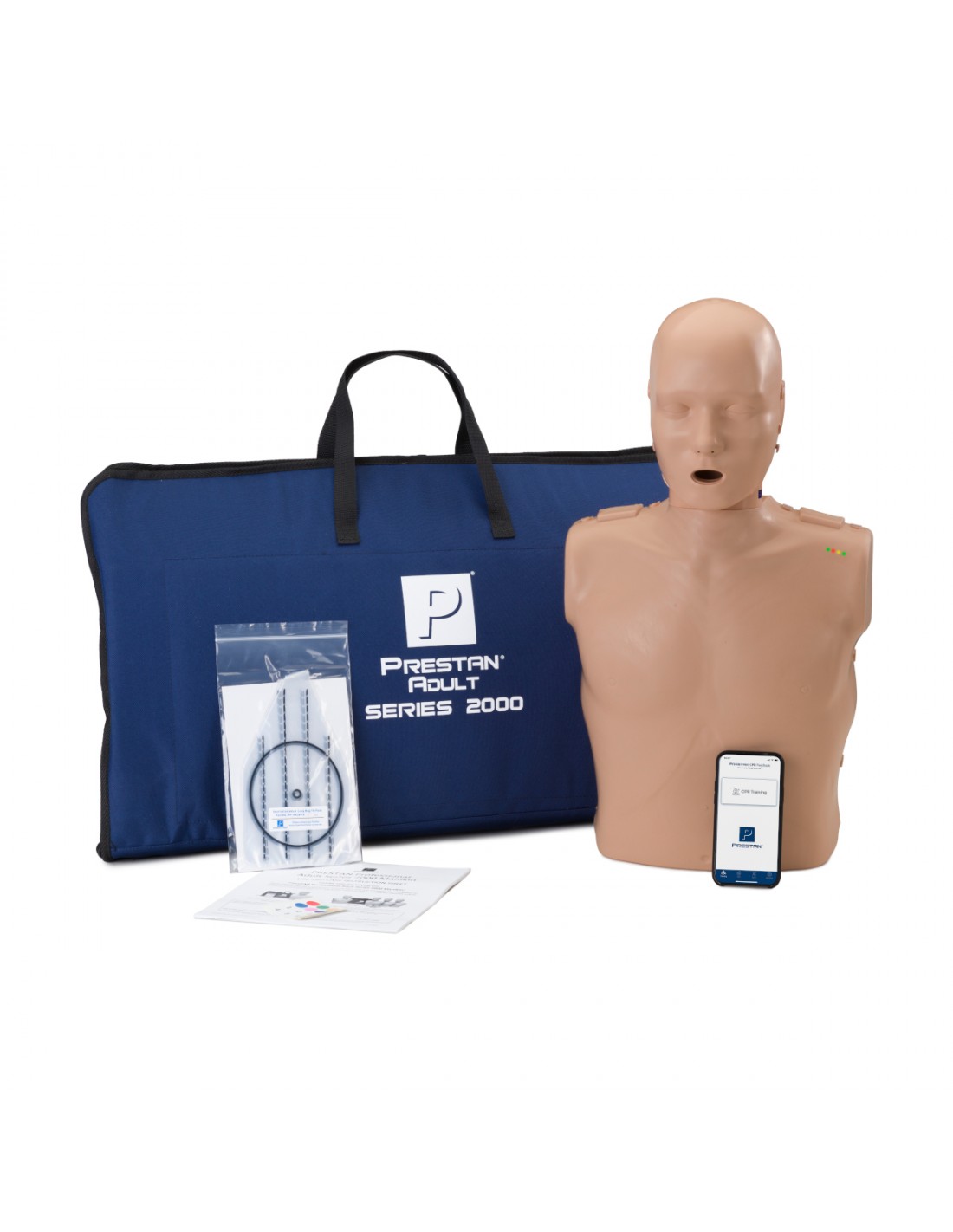 Fantom dorosłego PRESTAN 2000 z aplikacją CPR Feedback umożliwia realistyczny trening RKO i obsługi AED dzięki systemowi informacji zwrotnej w czasie rzeczywistym (LED, dźwięk „klik-klak” i opór ucisku). Zestaw zawiera manekin, 10 dróg oddechowych oraz torbę transportową pełniącą funkcję maty ćwiczeniowej.
