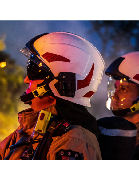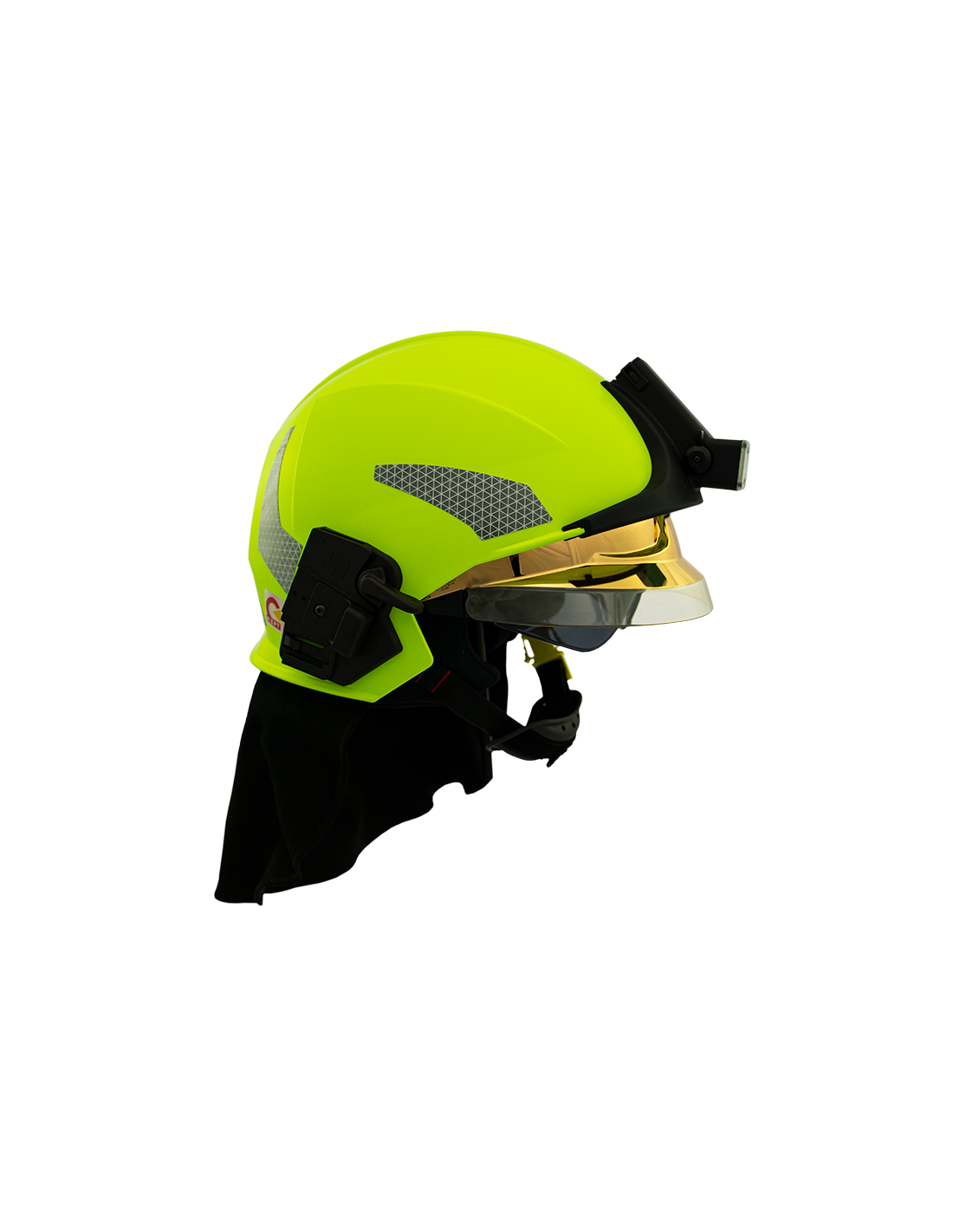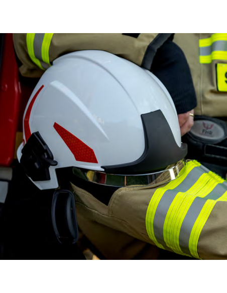 - Osłona twarzy – wizjer w klasie optycznej 1, chowany do wewnątrz hełmu, pokryty złotym filtrem chroniącym przed promieniowaniem podczerwonym. Wizjer profilowany - jego kształt pozwala na użytkowanie go jednocześnie z maską oddechową.