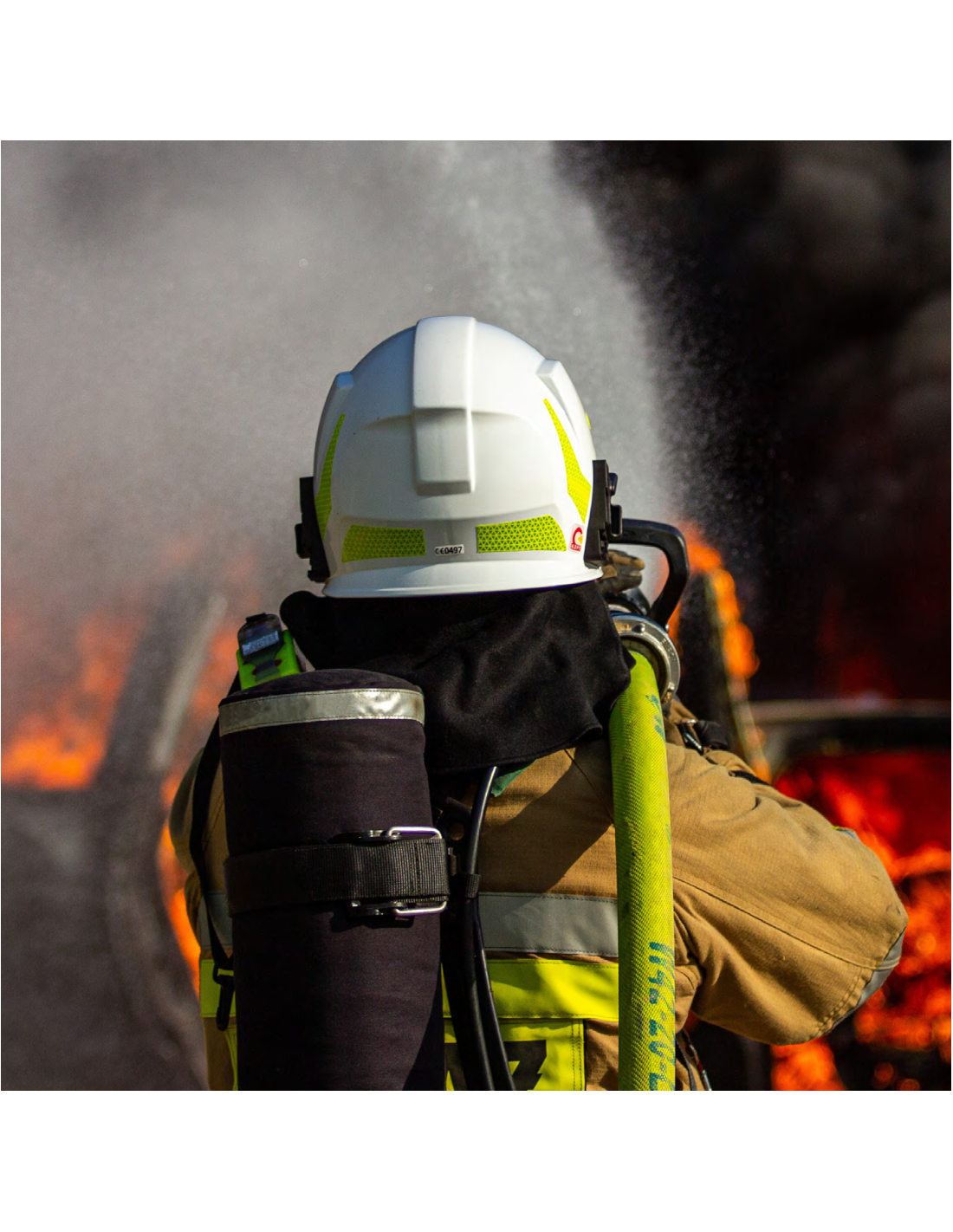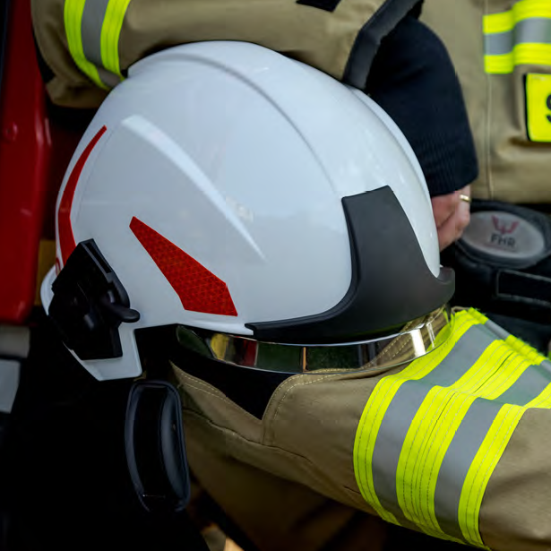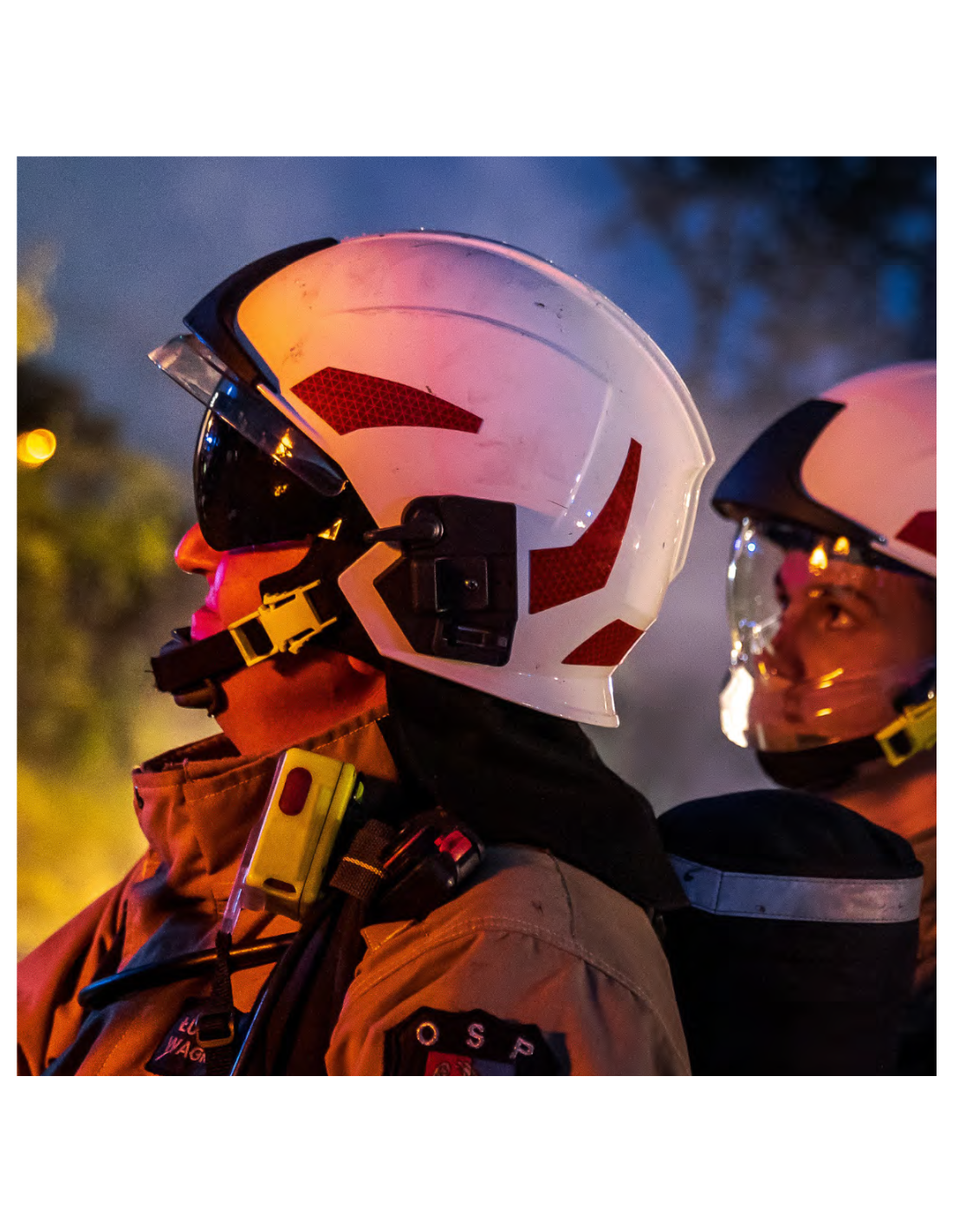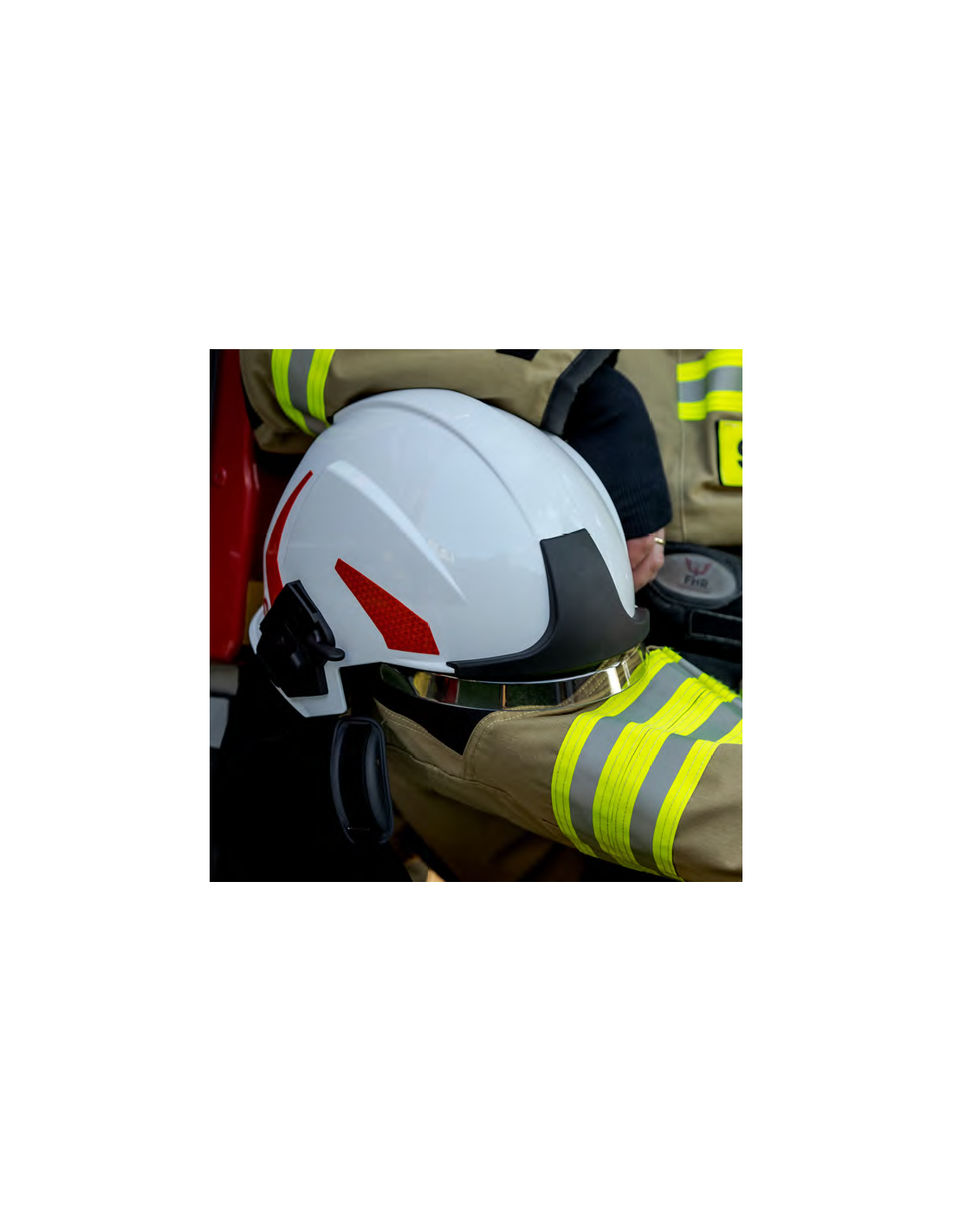 - Chowana do wewnątrz osłona oczu – transparentne okulary w klasie optycznej 1, chroniące oczy przed ciałami stałymi i cieczami w czasie wykonywania zadań ratowniczych.