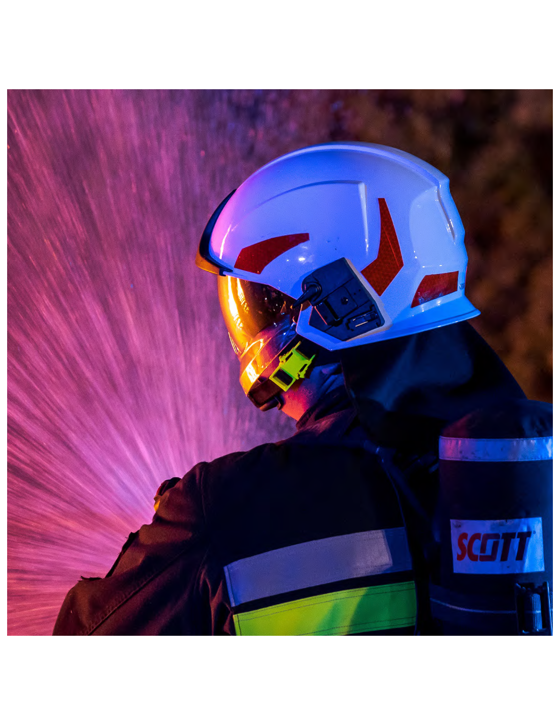 - Chowana do wewnątrz osłona oczu – transparentne okulary w klasie optycznej 1, chroniące oczy przed ciałami stałymi i cieczami w czasie wykonywania zadań ratowniczych.
