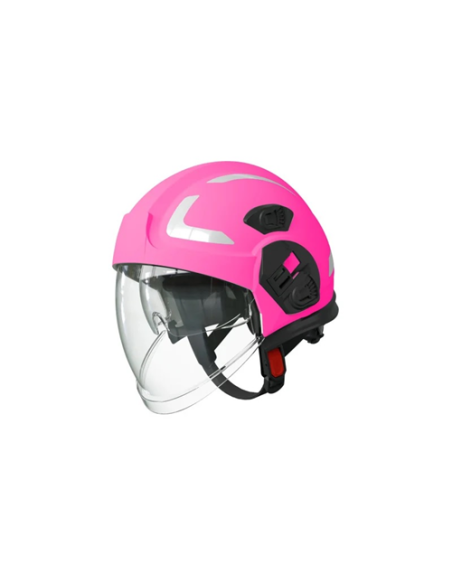 Różowy hełm strażacki DRAGON HT-05 z przyłbicą. Wytrzymała konstrukcja, regulacja dopasowania i wysoki poziom ochrony w działaniach ratowniczych.