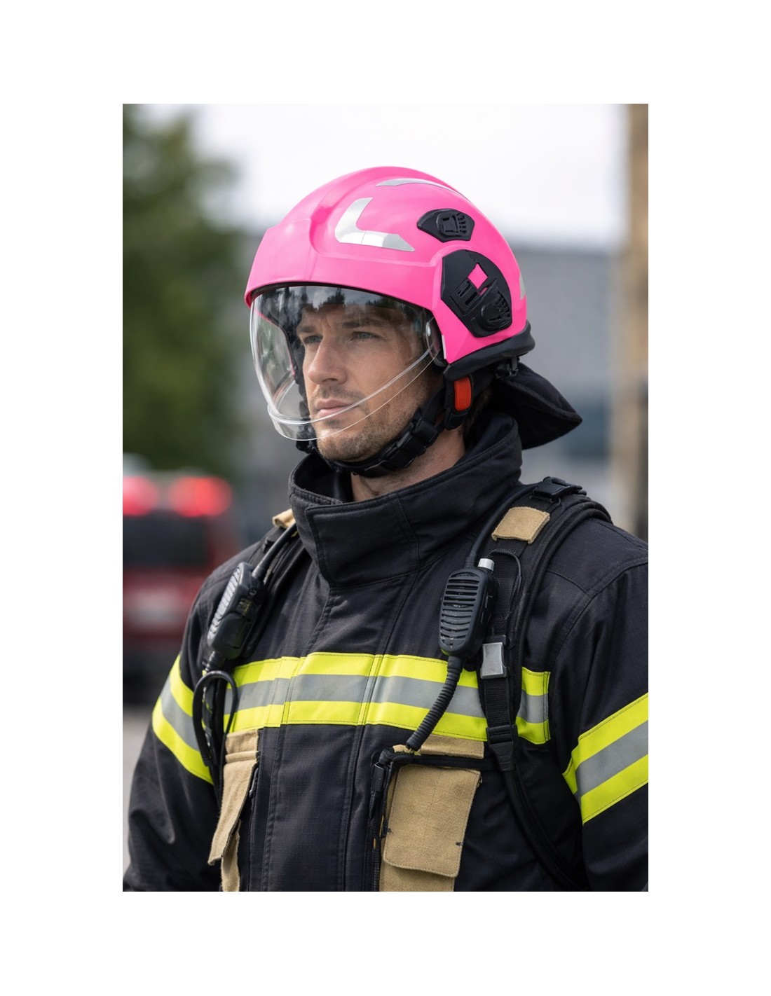 Hełm strażacki DRAGON HT-05 w kolorze różowym to nowoczesny hełm ratowniczy przeznaczony do działań ratownictwa technicznego, drogowego oraz zabezpieczania miejsc zdarzeń. Konstrukcja hełmu spełnia wymagania normy EN 16471 i EN 16473 (hełmy do pożarów w przestrzeni otwartej oraz ratownictwa technicznego), co potwierdza jego przeznaczenie do profesjonalnych działań służb ratowniczych.