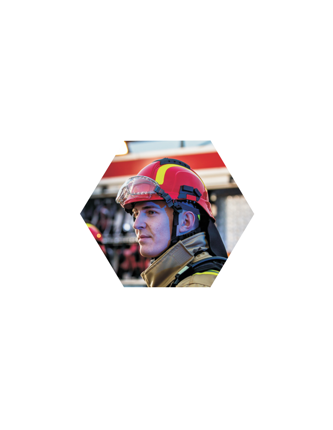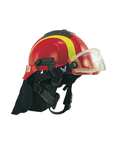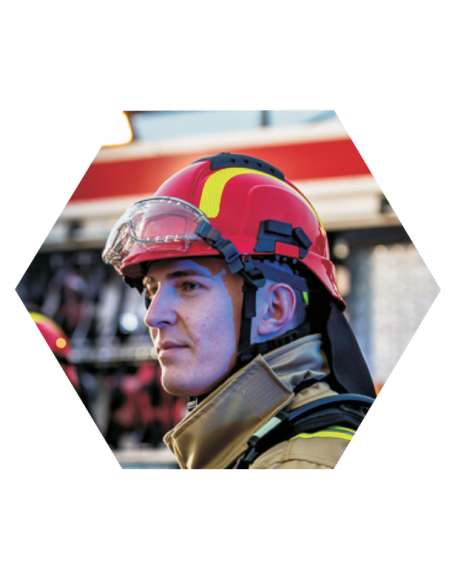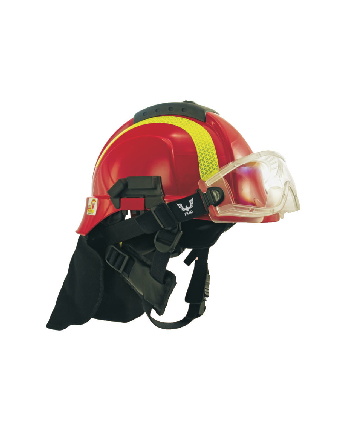 W cenie hełmu: uniwersalny uchwyt do montażu nahełmowej maski oddechowej, panelowy system wentylacji, osłona karku z tkaniny ognioodpornej, gogle FHR z powłoką anti-scratch i anti-fog