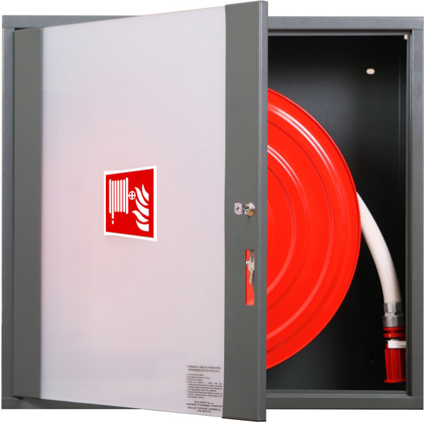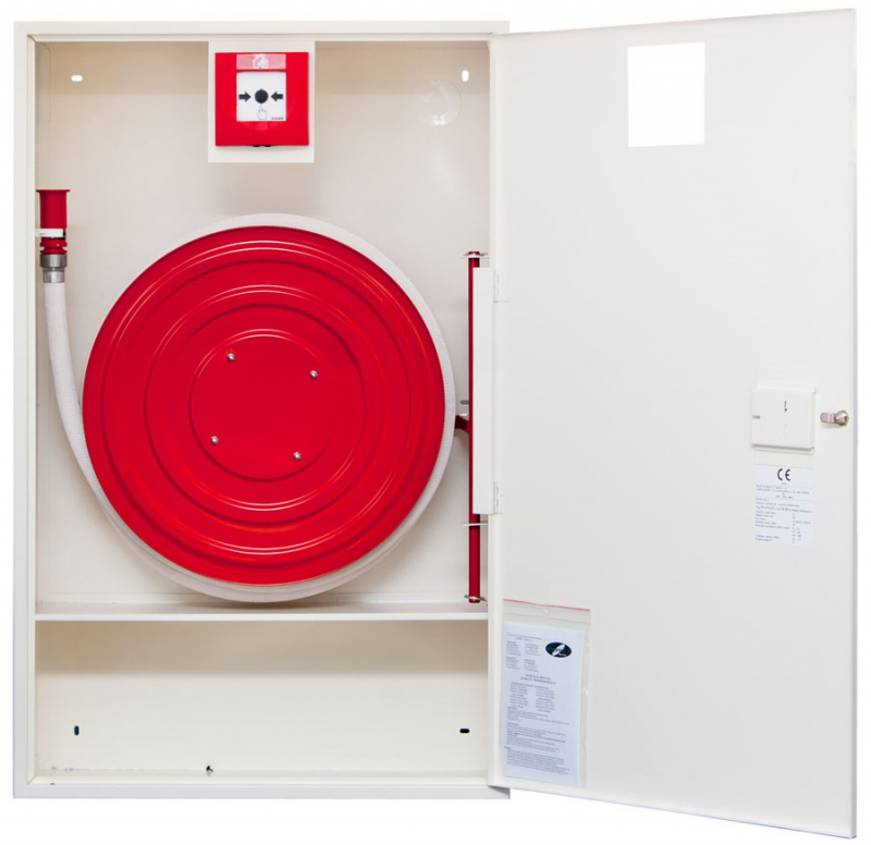 Hydrant wnękowy FI25 z miejscem na gaśnicę, prawy - hydrant i gaśnica w jednym miejscu wewnętrz chronionego budynku