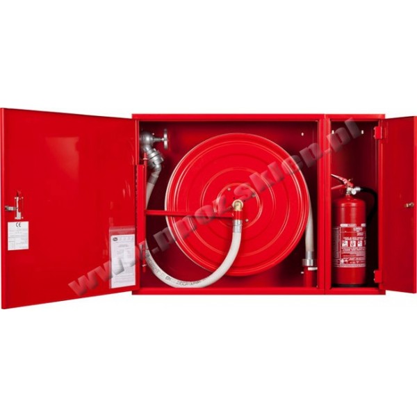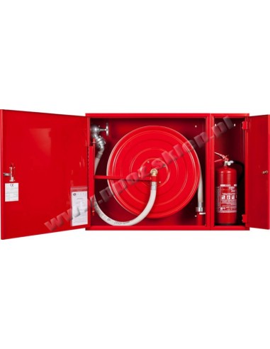 Hydrant zawieszany FI33 z miejscem na gaśnicę, lewy - hydrant i gaśnica w jednej skrzynce ppoż - praktyczne rozwiązanie w małych obiektach