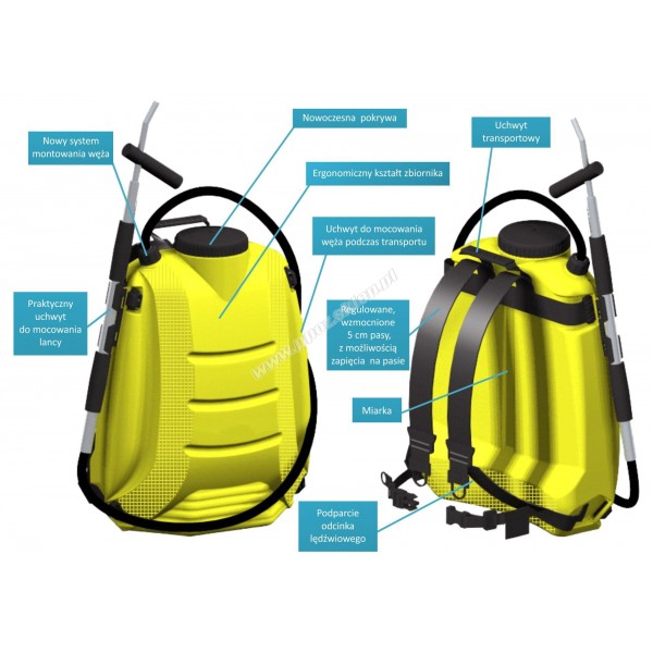 Ergonomiczna Hydronetka plecakowa ERGO S1 z lancą dalekiego zasięgu (7-12m), z wężem elastycznym, wyściełanymi pasami i regulowanym paskiem, o pojemności 17,5 litra.