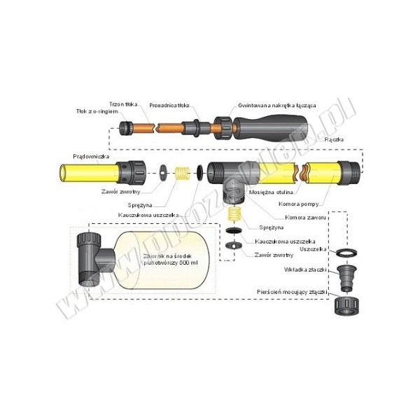 POMPKA metalowa ssąco-tłocząca z plastikową rączką. Prądownica wyjściowa jest nastawna (strumień rozproszony i zwarty). Przy strumieniu zwartym poziomym zasięg wynosi 12 m, pionowym 7 m. Wydajność hydronetki na minutę zależna jest od ilości ruchów pompą wykonanych przez operatora. Wydajność powyżej 2 l/min uzyskuje się przy 17 ruchach pompą. Pompka posiada dwa zawory kulowe, które zabezpieczają przed rozlewaniem wody w przypadku, gdy prądownica znajduje się poniżej zbiornika. Przy połączeniu węża z hydronetką może być dodatkowo zainstalowany dodatkowy zawór kulowy (oferowany bezpłatnie).