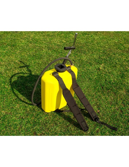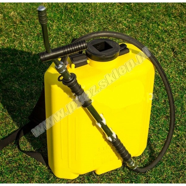 składa się z pompki, sztywnego zbiornika (17,5 l) i zbrojonego plastikowego węża.
