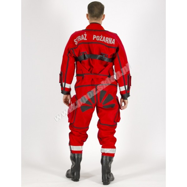 a/ wykonany z tkaniny wodoszczelnej trilaminat ( poliester na wierzchu, guma butylowa w środku, poliester od spodu ), posiada kryzę szyjną lateksową + kołnierz neoprenowy bez rzepów zapinających, zamek wejściowy gazoszczelny plastikowy YKK z przodu w poziomie, szlufki na pas asekuracyjny na wysokości klatki piersiowej z przodu i z tyłu ( w wersji Advanced dodatkowe wypornościowe wkłady piankowe umieszczone od wewnątrz w komorach ), na rękawach umieszczone na przedramieniu kieszonki na rękawice neoprenowe – rękawy zakończone wklejonymi kryzami lateksowymi stożkowymi, z przodu na wysokości podbrzusza dodatkowy zamek gazoszczelny plastikowy tzw. ulg YKK, zamykany patką na rzep, na nogawkach po bokach kieszenie naklejane „cargo” z patkami zamykającymi na rzep, dodatkowo na nogawkach z przodu wzmocnienie z cordury, na siedzeniu dodatkowa łata z cordury z pojedynczymi łatkami z kevlarowymi kształcie „słoneczka”, buty z obcasem zintegrowane z nogawkami, wzmocnienia z tkaniny zasadniczej na kolanach i siedzeniu, na kolanach i łokciach dodatkowe wewnętrzne wstawki piankowe w celu absorpcji, szelki wewnętrzne, napis Straż Pożarna na plecach, na patkach kieszeni cargo transfer eques oraz standardowe logo „konika morskiego”, na nogawkach koło butów oraz na rękawach koło nadgarstków