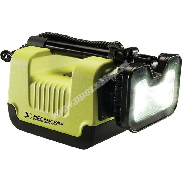 Przenośny system oświetlenia ATEX PELI RALS 9455 to zestaw do pracy w ciężkich warunkach. Moc maksymalna to 1600 lumenów. Zestaw pracuje od 5 do 10 godzin na jednym ładowaniu w zależności od użytej mocy. Standardowe są trzy tryby pracy – pełna moc, połowa mocy i tryb ostrzegawczy/stroboskopowy. Maksymalna wysokość rozłożonego masztu to 80 cm. Poziom rozładowania baterii jest sygnalizowany na 30 i 15 minut przed rozładowaniem. Akumulator jest zamontowany na stałe wewnątrz obudowy, wykonany w technologii niklowo kadmowej. Czas ładowania od pełnego rozładowania to maksymalnie 5 godzin. Żywotność akumulatora wynosi 300 ładowań od zera i 600 ładowań od połowy poziomu naładowania. Zestaw ma szczelność IP54 co pozwala pracować także w deszczu i wilgoci. Żywotność diody LED to 50 000 godzin. Waga zestawu 10,5 kg. Wymiary złożonego urządzenia to 20x40x23 cm. Korpus wykonany jest z ultra trwałego tworzywa. Urządzenie występuje w kolorze żółtym.