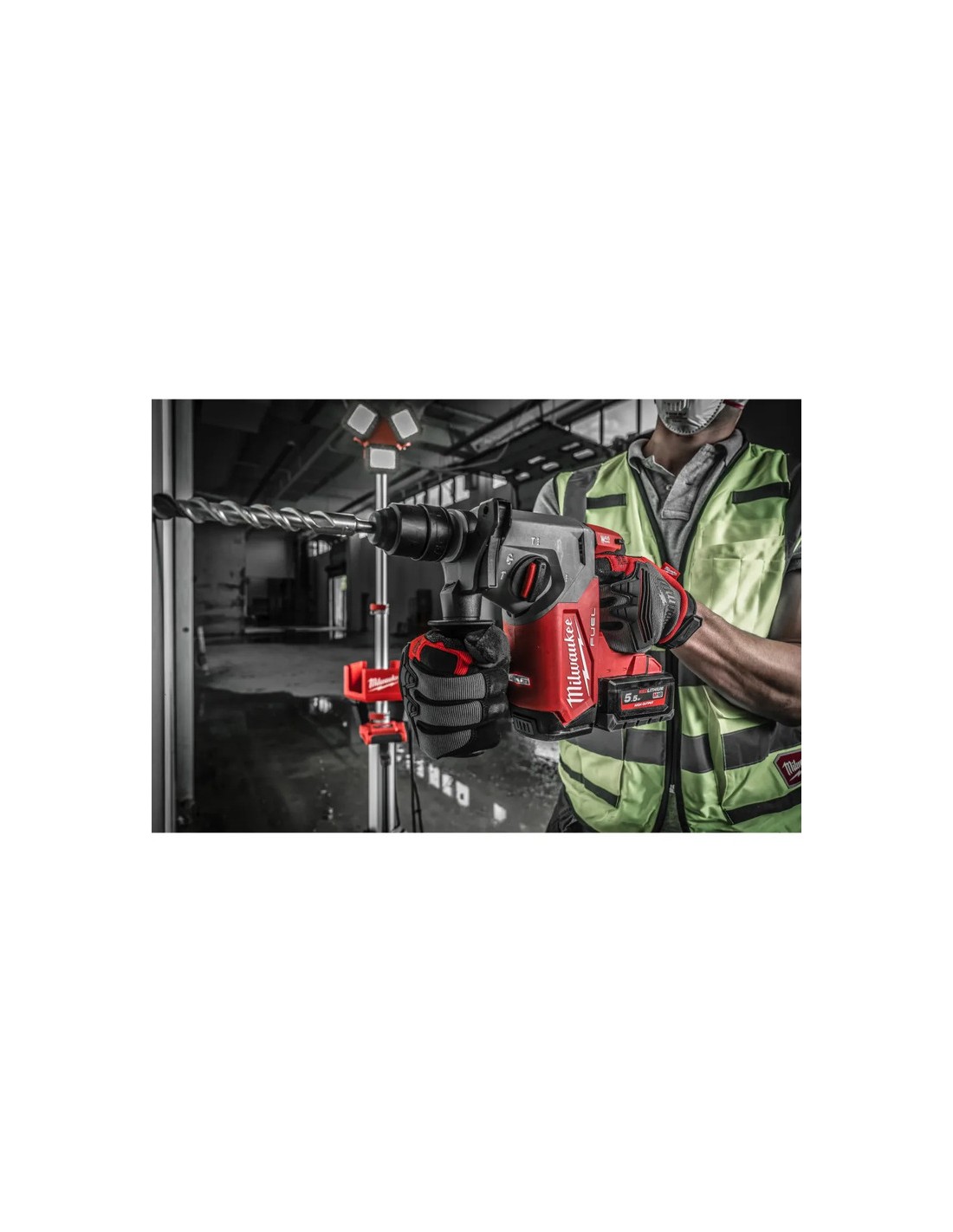 Młotowiertarka umożliwia wykonanie do 125 otworów (10 × 50 mm) na jednym akumulatorze M18™ HIGH OUTPUT™ 5,5 Ah, gwarantując ciągłość pracy w wymagających warunkach.
