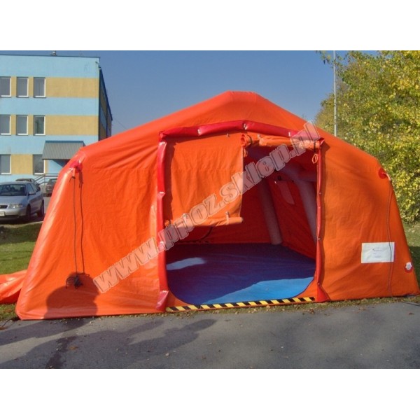 Powłoka namiotu wykonana z tkaniny poliestrowej pokrytej dwustronnie PVC, odporna na promieniowanie ultrafioletowe. Stelaż pneumatyczny wykonany z wielowarstwowej tkaniny poliestrowej na zewnątrz po obu stronach pokrytej PVC. Podłoga odpinana. Dwoje drzwi dwuskrzydłowych zwijanych, jednowarstwowych. Na zewnątrz drzwi znajdują się kołnierze umożliwiające łączenie z innymi namiotami. Na ścianach bocznych okna o wymiarach 57cm x 57cm, składające się z trzech warstw. Od wewnątrz na stelażu uchwyty rzepowe (możliwość swobodnego rozmieszenia w dowolnym miejscu na stelażu namiotu) do mocowania sprzętu oświetleniowego, sprzętu medycznego, itp. Na bocznych ścianach otwory z rękawami do wprowadzania do wewnątrz przewodów ogrzewania lub filtrowentylacji, przewodów elektrycznych, wodnych, itp. Na zewnątrz umocowane linki odciągowe oraz szpilki i paliki mocujące. Konstrukcja pneumatyczna (stelaż) mocowana na specjalnych uchwytach rzepowych, co umożliwia w przypadku awarii lub zużycia , możliwość wypięcia samej konstrukcji lub poszycia, w celu np. naprawy lub wymiany. Zastosowane materiały gwarantują prawidłową eksploatację namiotu w zakresie temperatur od –35 °C do +70 °C.