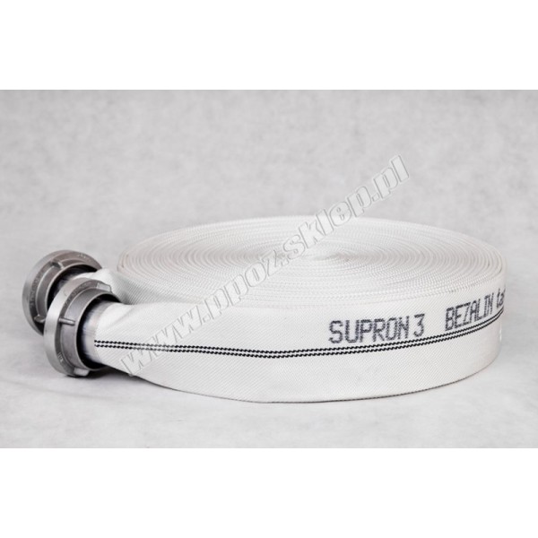 Wąż pożarniczy tłoczny z wkładką PCV typ W do motopomp i autopomp. Taśma wężowa produkcji Bezalin. Łącznik zakuty tuleją aluminiową. Długość węża 50m. Posiada Świadectwo Dopuszczenia CNBOP-PIB.Pożarnicze węże tłoczne typ W produkowane są z najwyższej jakości taśmy wężowej.