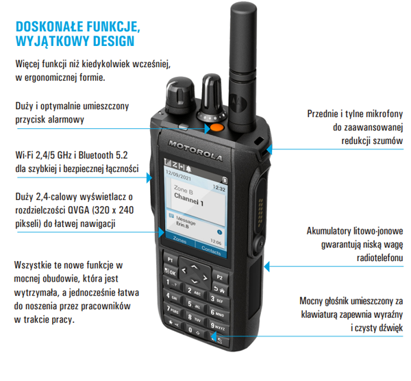Cyfrowe radio przenośne Motorola R7 z pełną klawiaturą to nowy flagowy model radiotelefonu od firmy Motorola Solutions. R7 Premium, będący najwyższym modelem z serii R7, charakteryzuje się imponującym wyświetlaczem QVGA, umożliwiającym wyświetlanie do 10 linii tekstu, wszystko to umieszczone w solidnej i eleganckiej obudowie. R7 występuje w dwóch różnych wersjach, z których każda oferuje unikalny zestaw funkcji. Wersje to R7 Capable (bez zaawansowanych funkcji w standardzie) oraz wersja R7 Premium, która już te funkcje posiada standardowo, a są to funkcje GNSS, Wi-Fi i Bluetooth.