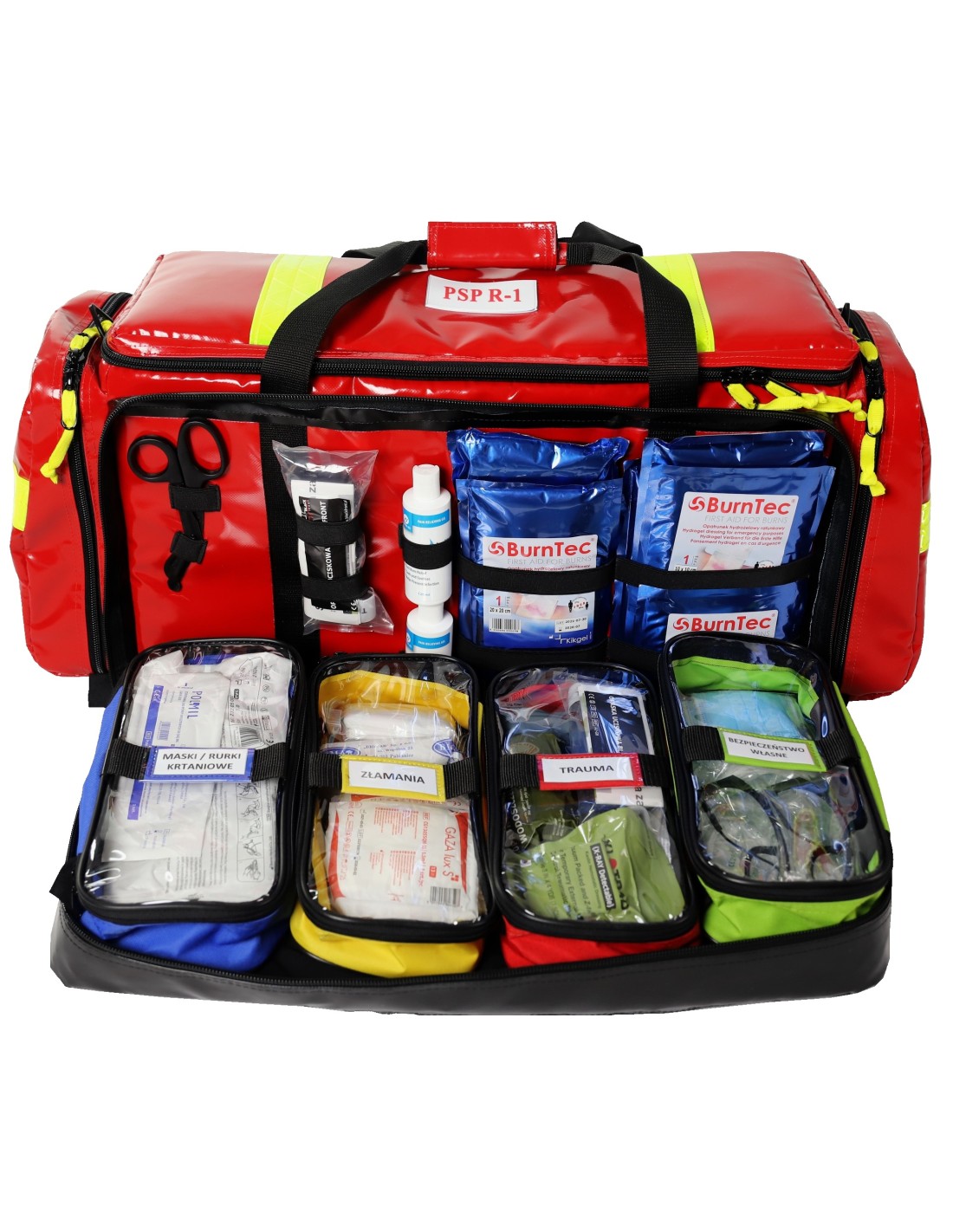 To rozbudowany wariant zestawu PSP R1, który poza pełnym wyposażeniem medycznym obejmuje również szyny do unieruchamiania urazów oraz sprzęt do transportu poszkodowanych. Takie rozwiązanie zwiększa funkcjonalność zestawu podczas działań ratowniczych i pozwala lepiej przygotować jednostkę do akcji w różnych warunkach terenowych.