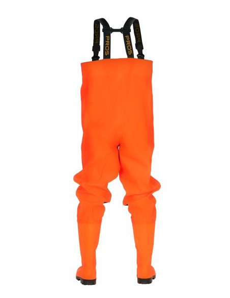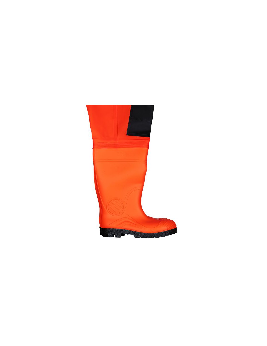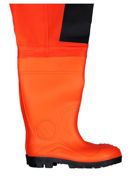 Spodniobuty wodochronne z wgrzanymi na stałe, wysokiej jakości kaloszami. Podwyższona odporność na uszkodzenia mechaniczne poprzez dodatkowe wzmocnienia na kolanach. Technika obustronnego zgrzewania zwiększa wytrzymałość szwów. Specjalna wkładka chroni podeszwę przed przebiciem, a nosek zwiększa bezpieczeństwo palców stóp. Możliwość regulacji obwodu na wysokości klatki piersiowej. Kieszeń wewnętrzna ułatwia przechowywanie dokumentów. Kolor fluo zapewnia lepszą widoczność.