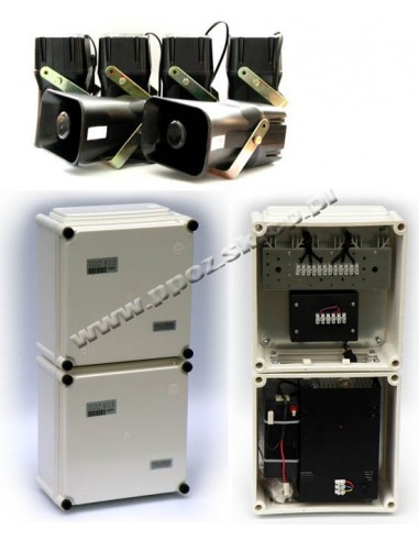 Zestaw składa się z centrali sterującej montowanej na ścianie oraz głośników tubowych, do samodzielnego zamocowania np no maszcie, belce itp.