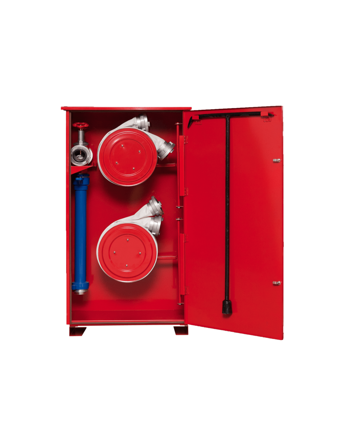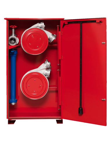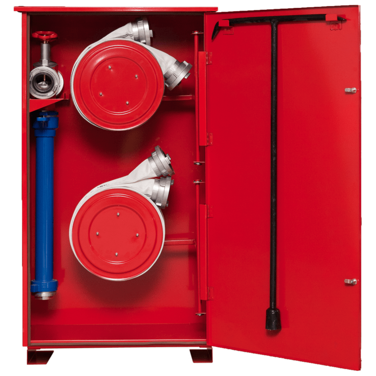 Szafa na stojak hydrantowy W-002 przeznaczona jest do przechowywania stojaka hydrantowego, dwóch węży tłocznych na zwijadle oraz klucza hydrantowego. Wykonana z trwałej blachy stalowej o grubości 1 mm, co zapewnia solidność i odporność na uszkodzenia. Fasada została wykonana z ocynkowanej blachy malowanej farbą fasadową, odporną na czynniki atmosferyczne. Szafa posiada funkcjonalne wymiary: wysokość 1300 mm, szerokość 700 mm i głębokość 350 mm.