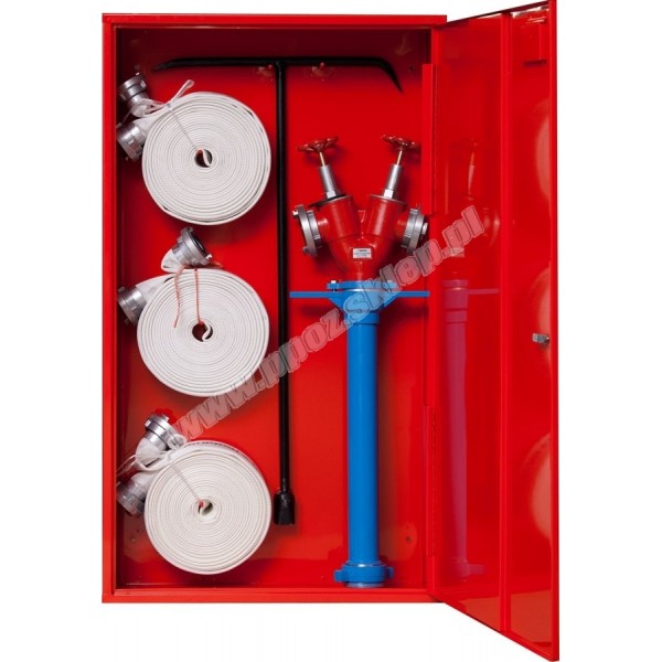 Szafa ppoż przeznaczona na stojak hydrantowy, 3 węże tłoczne i klucz, z możliwością przechowywania dodatkowego sprzętu pożarniczego. Wykonana z blachy 1 mm, dostępna w wersji malowanej lub INOX; wymiary: 1300×700×250 mm (wys./szer./gł.).