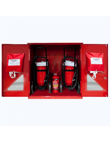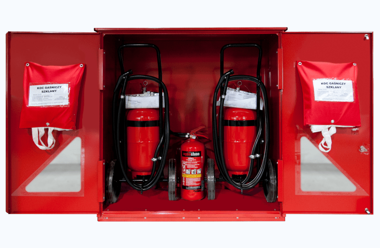 Szafa pozwala na przechowywanie podręcznego sprzętu gaśniczego zgodnie z Rozporządzeniem Ministra Spraw Wewnętrznych i Administracji z dnia 19 lutego 2020 r. „w sprawie wymagań w zakresie ochrony przeciwpożarowej, jakie mają spełniać obiekty budowlane lub ich części oraz inne miejsca przeznaczone do zbierania, magazynowania lub przetwarzania odpadów” w postaci: 2 gaśnice przewoźne 25 kg, 2 gaśnice przenośne, dwa koce 2 x 3 m.