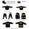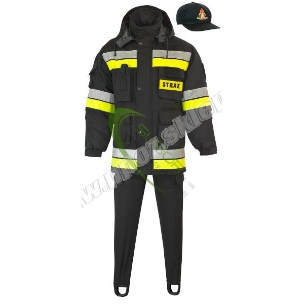 Napisy "STRAŻ" na żółtej tkaninie fluorescencyjnej na plecach i na lewej piersi bluzy i kamizelki, taśma odblaskowa żółta z trójkątami ostrzegawczymi srebrnymi na nogawkach spodni oraz nad prawą górną kieszenią kamizelki oraz w dolnej tylnej części kamizelki.