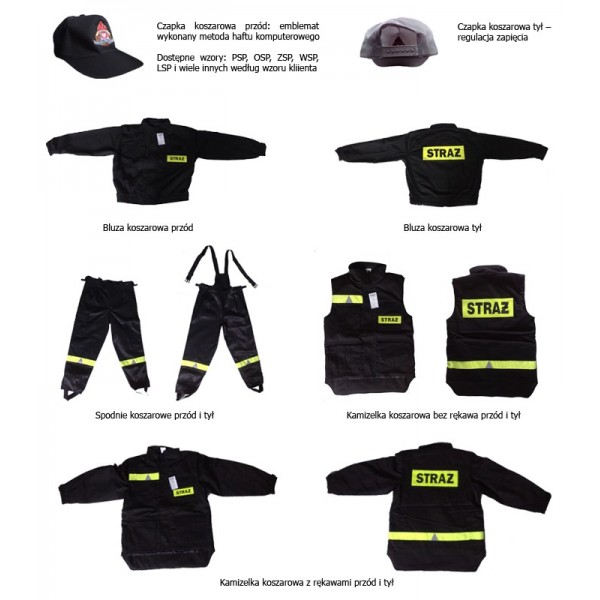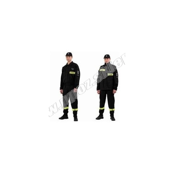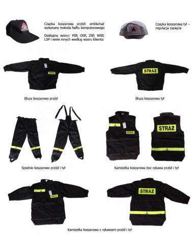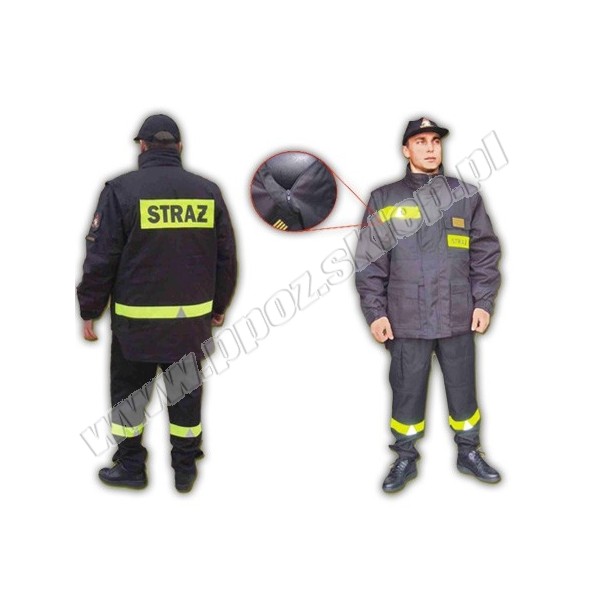 Napisy "STRAŻ" na żółtej tkaninie fluorescencyjnej na plecach i na lewej piersi bluzy i kamizelki, taśma odblaskowa żółta z trójkątami ostrzegawczymi srebrnymi na nogawkach spodni oraz nad prawą górną kieszenią kamizelki oraz w dolnej tylnej części kamizelki.