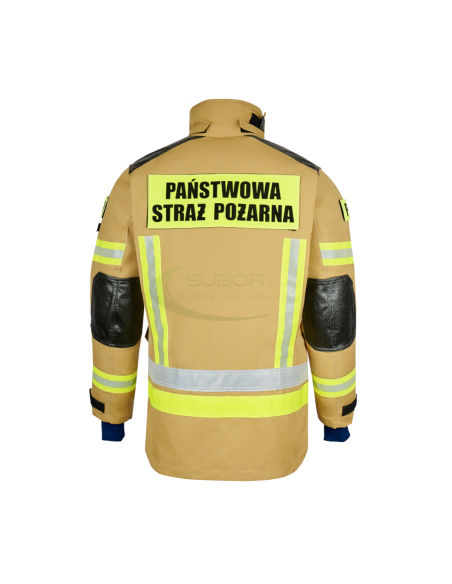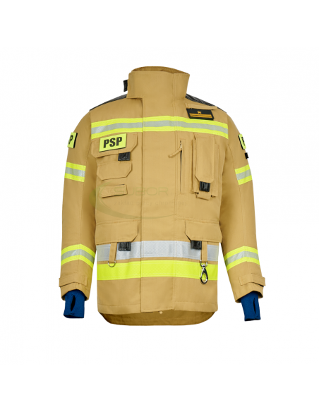 Materiał: tkanina w kolorze piaskowym żółtym w odcieniu naturalnego aramidu o składzie: 93% metaaramid, 5% paraaramid, 2% antystatyk, o gramaturze 210 g/m2 .