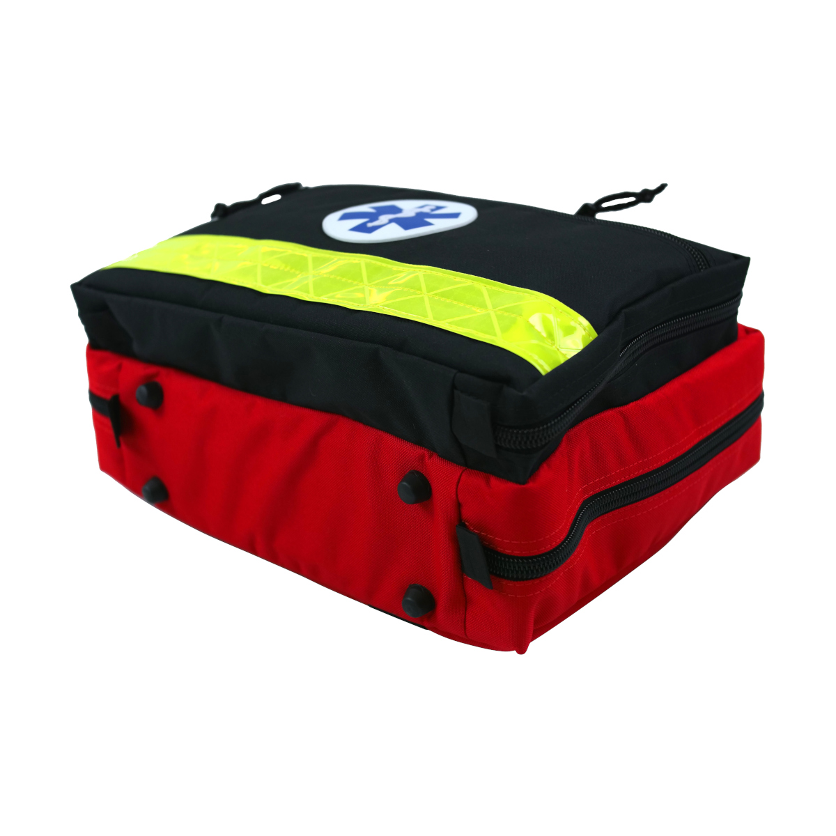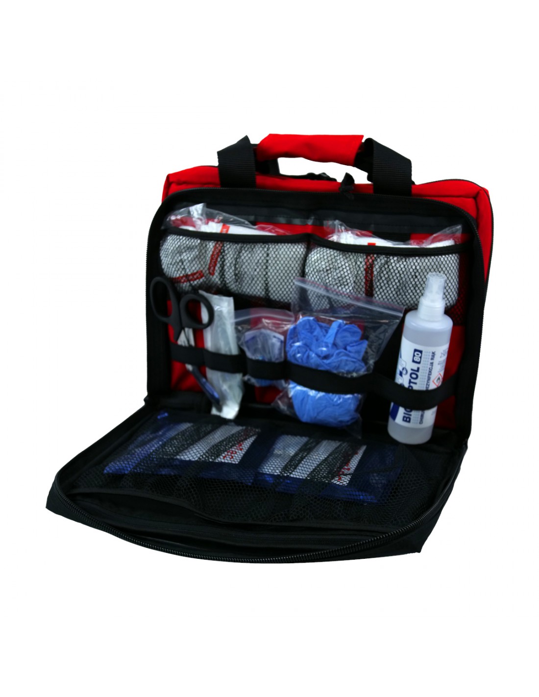 Torbę BF-SM do apteczki pierwszej pomocy typu “II” cechuje wysoka funkcjonalność i przemyślane rozwiązania konstrukcyjne. Sprawiają one, że dostęp do wyposażenia jest intuicyjny, a wszystkie sprzęty mają odpowiednie miejsce i są dostępne dla ratownika. Torba składa się z przestronnej komory głównej, w której znajdują się liczne gumowe przeszycia, mocowania i uchwyty. Komorę główną przedzielono specjalną zakładką, która po jednej stronie posiada pojemną kieszeń siatkową, a po drugiej przeźroczystą kieszeń. Z frontalnej strony umieszczono niezależną komorę z licznymi gumowymi przeszyciami, a także z kieszeniami siatkowymi. Dodatkowo na przedniej komorze użytkownik ma dostęp do kieszeni zamykanej na zamek błyskawiczny.