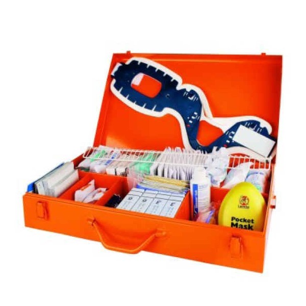 Przenośny Zestaw Pierwszej Pomocy ZPP typ B w walizce to profesjonalna apteczka dla zakładów pracy (5–50 osób), umieszczona w wytrzymałej metalowej walizce z uchwytem do zawieszenia. Zawiera szeroki zestaw opatrunków, środków ochrony osobistej i sprzętu ratunkowego zgodnego z normami UE.