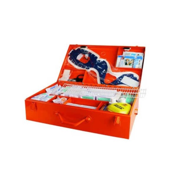 Przenośny Zestaw Pierwszej Pomocy ZPP typ C – metalowa walizka z uchwytem i półką do montażu na ścianie, przeznaczona dla dużych zakładów pracy, zgodna z normami UE.