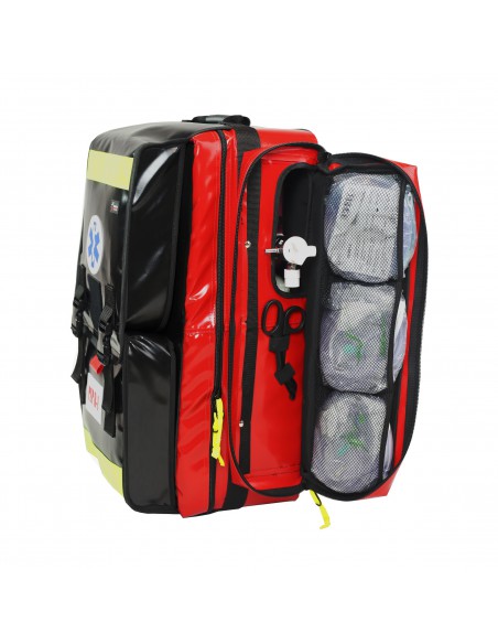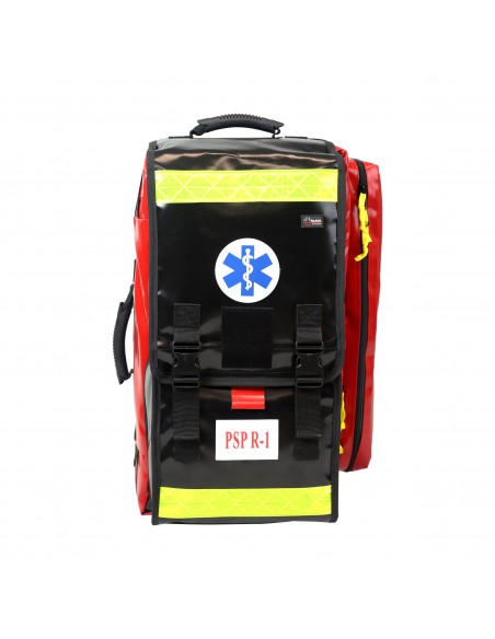 Plecak BLACK FRONT, model BF-XL do zestawu PSP R1 został skonstruowany na podstawie wieloletnich doświadczeń ratowników medycznych i czynnych instruktorów ratownictwa. Wykonany jest z z certyfikowanego materiału poliestrowego powlekanego POLYPLANEM z atestem odporności ogniowej DIN EN 13 501-1, charakteryzującego się niezwykłą wytrzymałością na przetarcia oraz wpływ niekorzystnych warunków atmosferycznych. Jest także wodoodporny i w pełni zmywalny umożliwiając tym samym łatwą dezynfekcję. Bezpieczeństwo wyposażenia oraz trwałość kształtu plecaka zapewnia lekki stelaż aluminiowy obłożony grubą pianką izolacyjną.